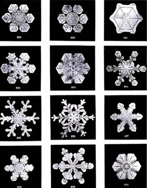 Wilson Bentley, un fermier américain, a occupé 40 de ses hivers à photographier des flocons de neige qu'il regardait sous un microscope. Il semble que sur les milliers de clichés qu'il a réalisés, il n'en obtint pas deux identiques ! Si le flocon a toujours ces six branches, on ne trouve jamais les mêmes détails dans les formes."
