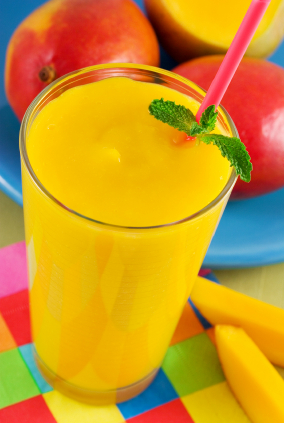 Mixez la mangue et la papaye avec le jus d'ananas, et les feuilles tendres de citronnelle.