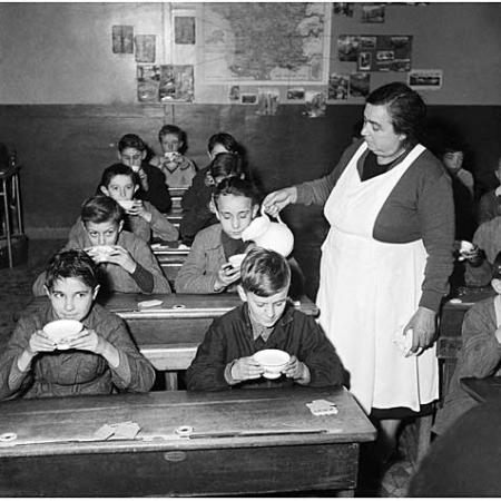 Distribution de lait à l'école. FRANCE 1954 ( sous Pierre MENDES FRANCE )