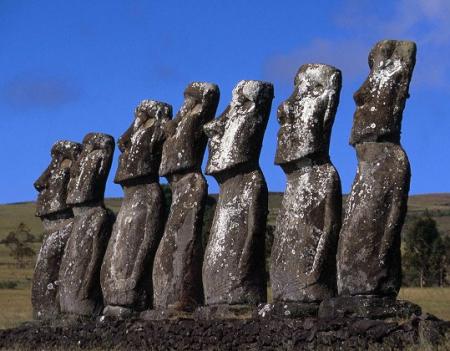 Les "Moaï" : ce sont des statues gigantesques, mesurant entre 1 et 20 mètres de haut. Leur visage est disproportionné par rapport à leur corps. On estime leur nombre à environ 600. Elles ont été taillées dans la carrière du volcan Rano Raraku à l'est de l'île. On peut même encore y voir des statues inachevées.